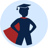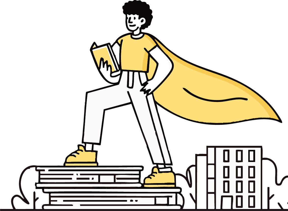 Illustration of a person with a cape, standing on books, holding a book, symbolizing a superhero or a person with knowledge and confidence.
