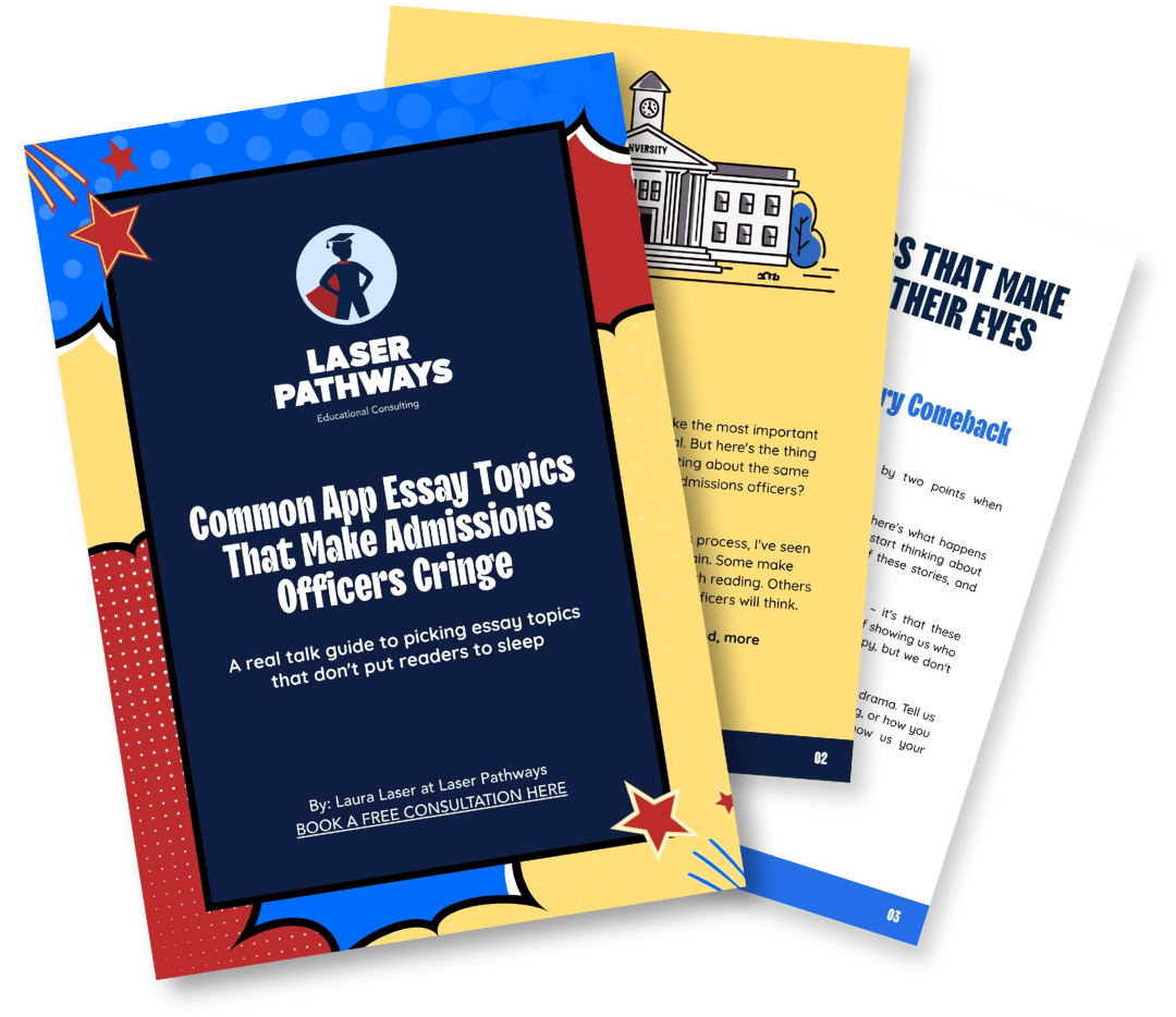Colorful brochure titled 'Common App Essay Topics That Make Admissions Officers Cringe' by Laura Laser at Laser Pathways, with cartoon-style illustrations of a university building and abstract comic book-like graphics surrounding the text.