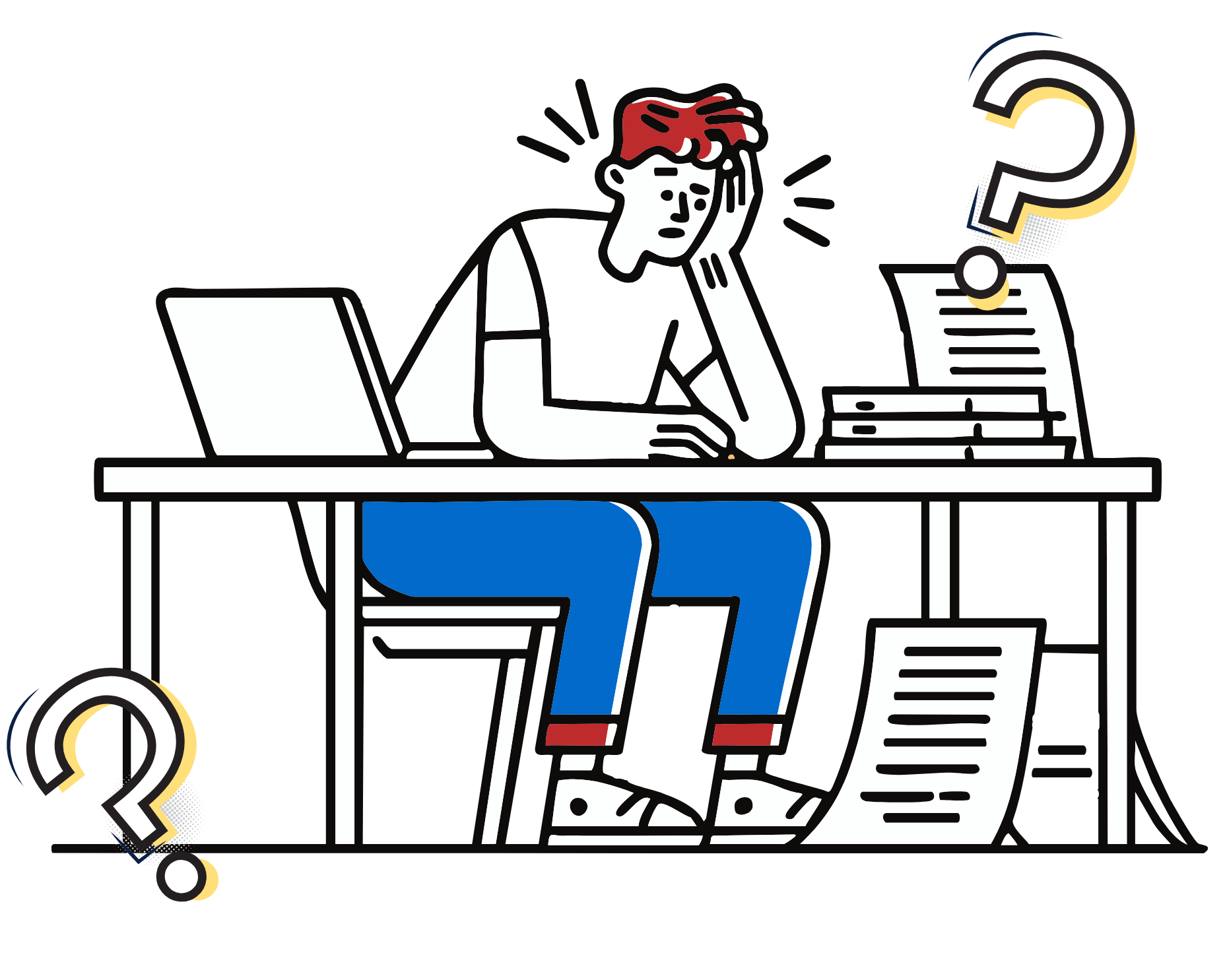 Illustration of a person sitting at a desk with a laptop, surrounded by stacks of papers, looking stressed with a hand on their forehead, with large question marks on either side.